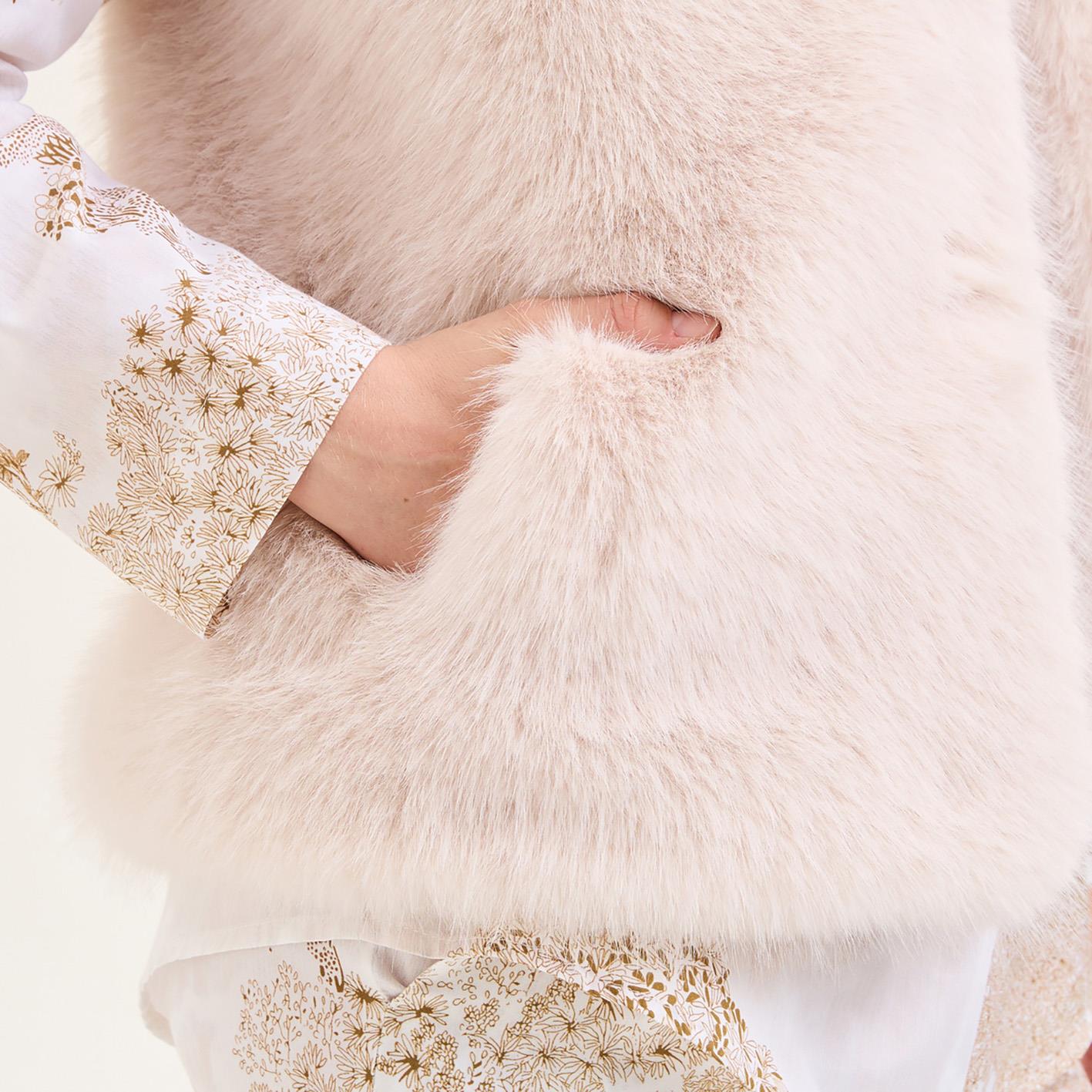 Dış kısmı suni kürk, astarı mat saten kolsuz yelek. Önde yarım cepler mevcuttur.
