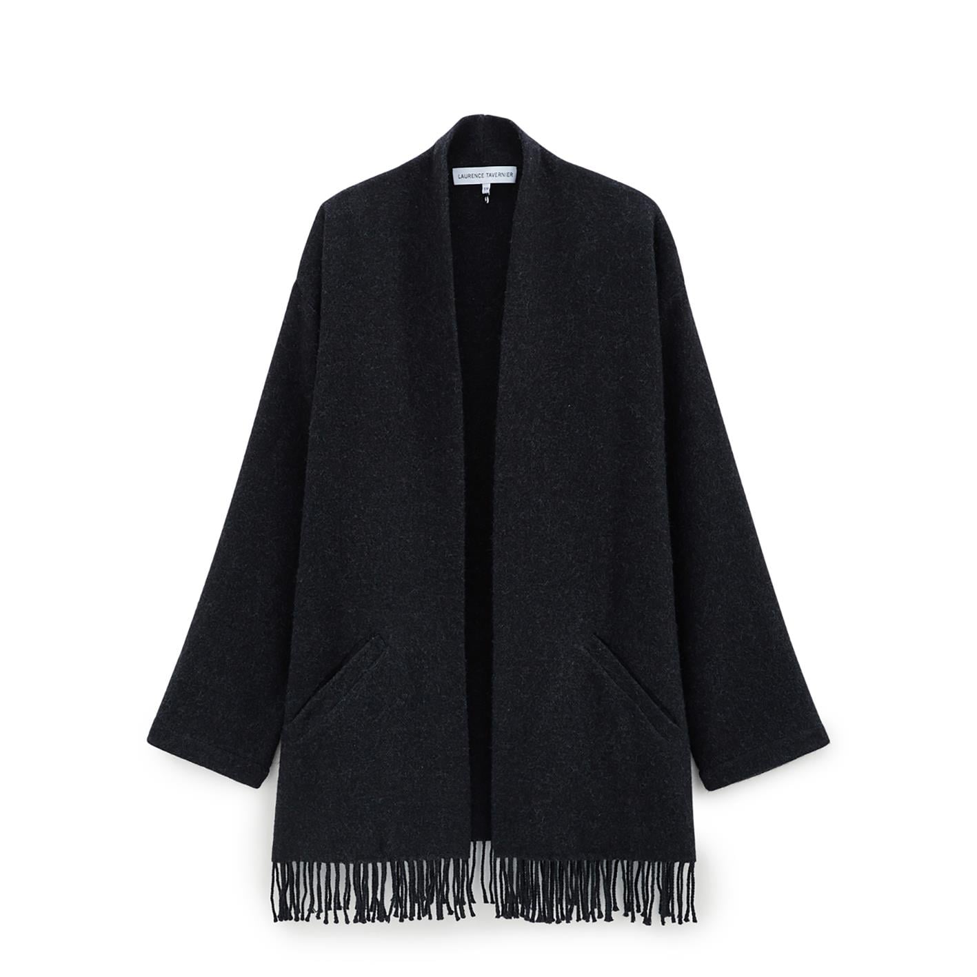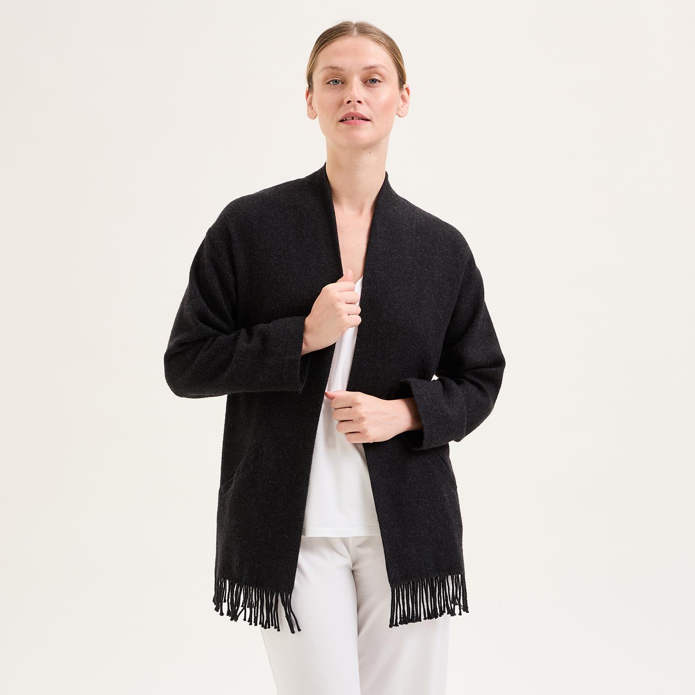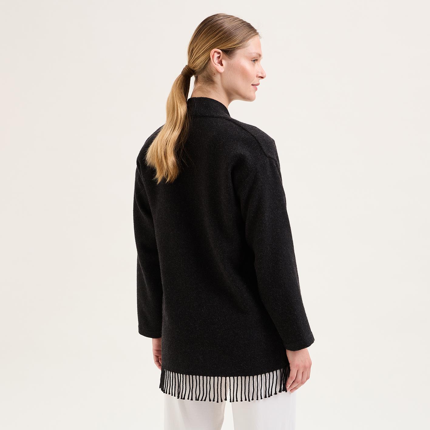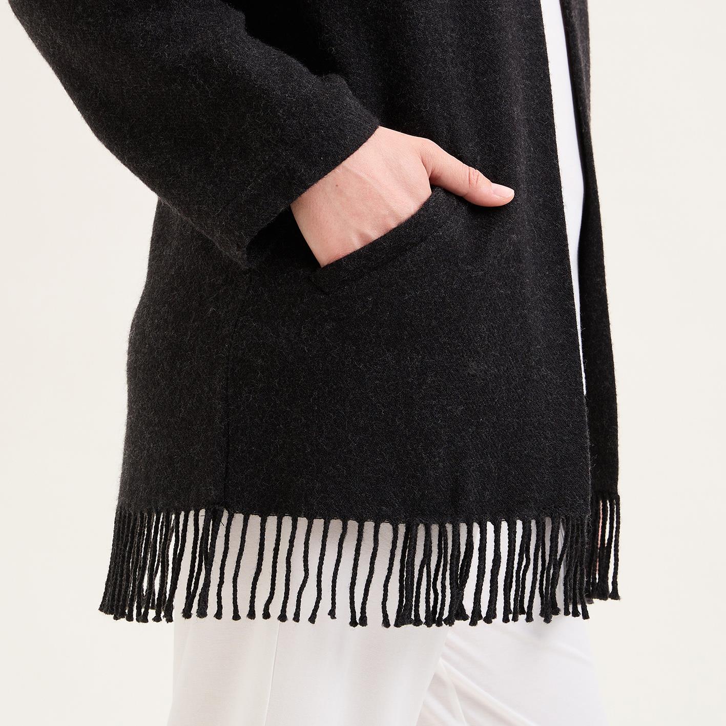 Taraklanmış yünden, güzel bir kalitede kısa panço.Önde biyeli cepler, alt kısmında püsküllü bitiş.