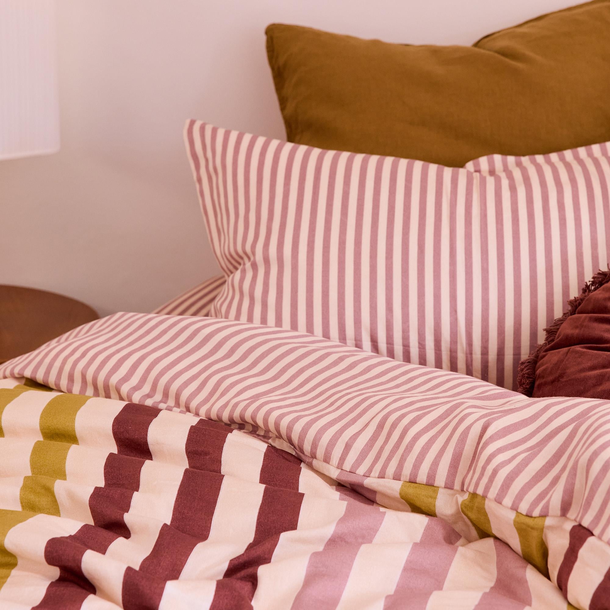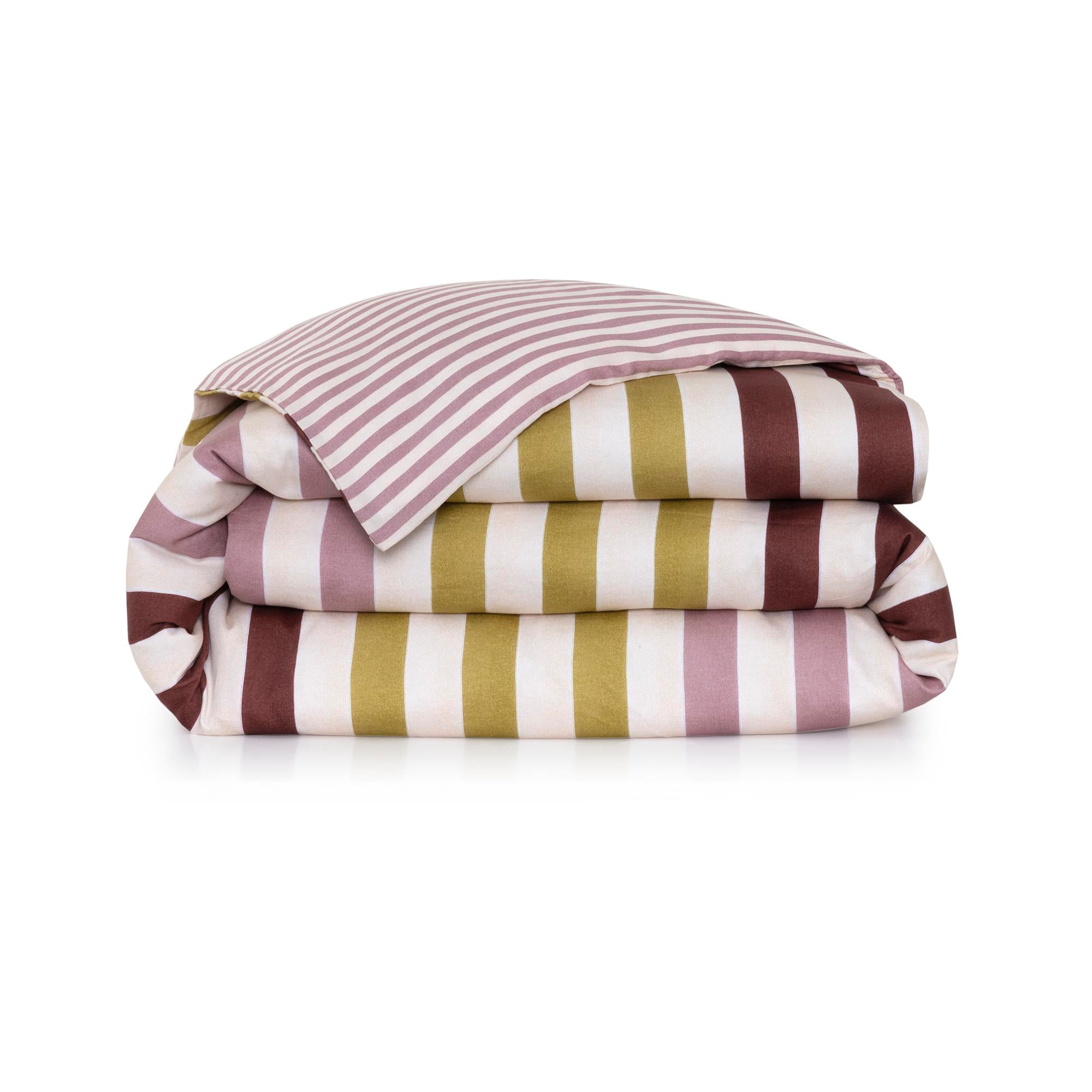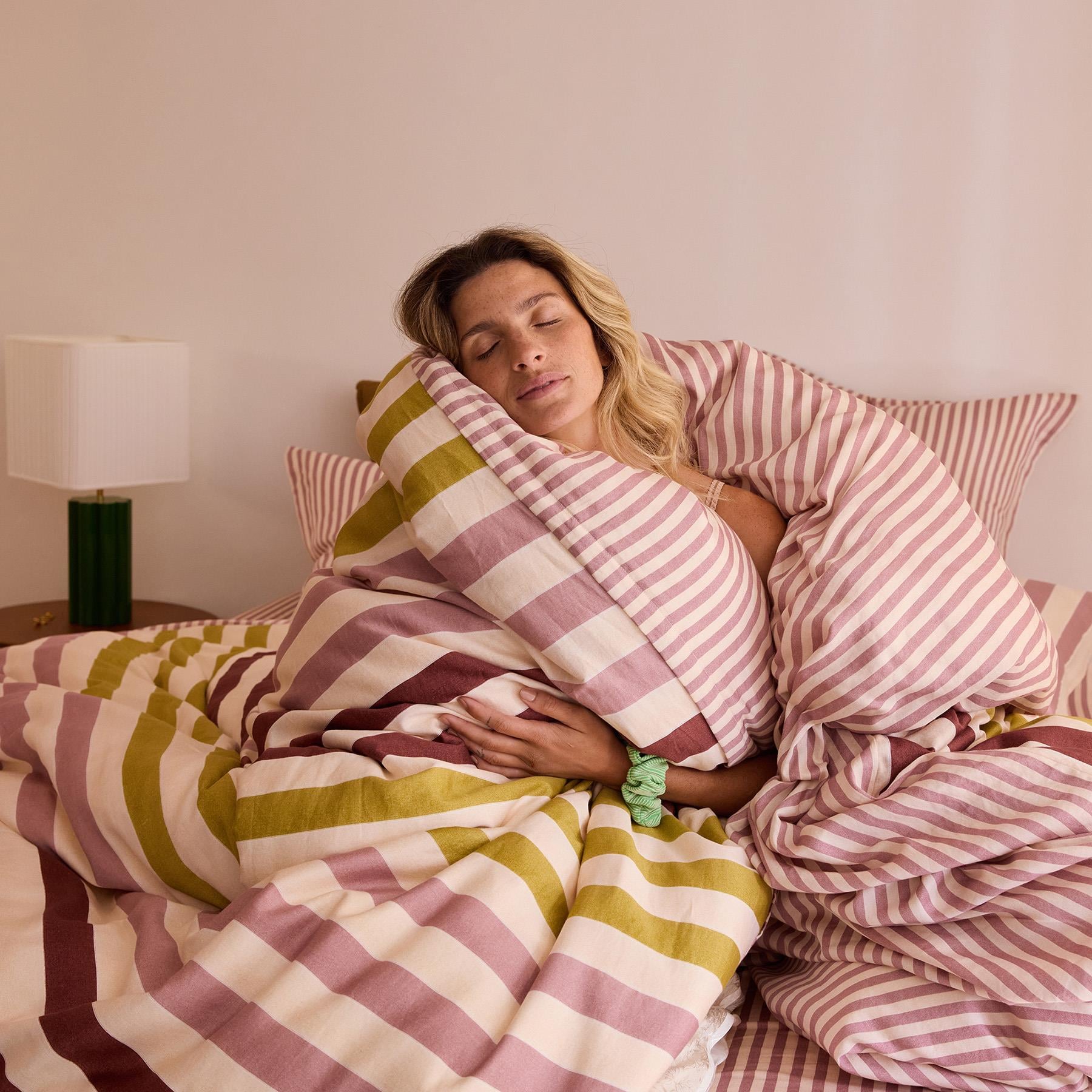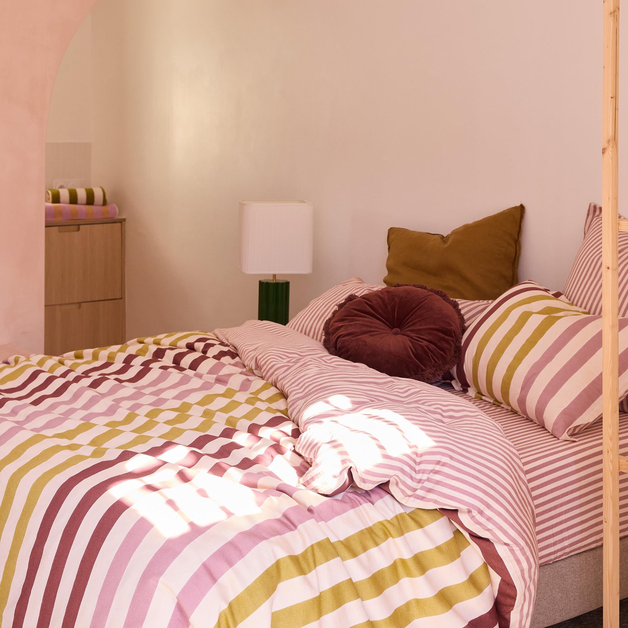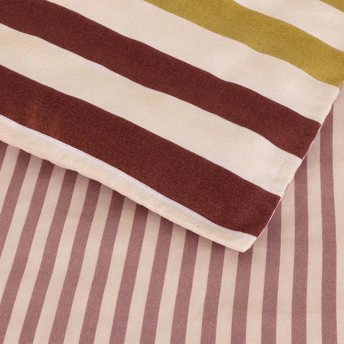 Geniş çizgiler, yıkanmış saten üzerine baskılı ve ince bir kazayağı dokusu efektiyle hafifçe titreşiyor. Ritmi ise huzurlu kılıyor; çünkü bu çizgiler, doğal ekru zemin üzerinde birbirleriyle nazikçe yarışan üçlü bir renk paletine sahip: çiğdem pembesi, altın yeşili ve bordo. Arka yüzünde ise çiğdem ve ekru renklerinde gömlek çizgisi deseni yer alıyor. Baştan sona zarafet.