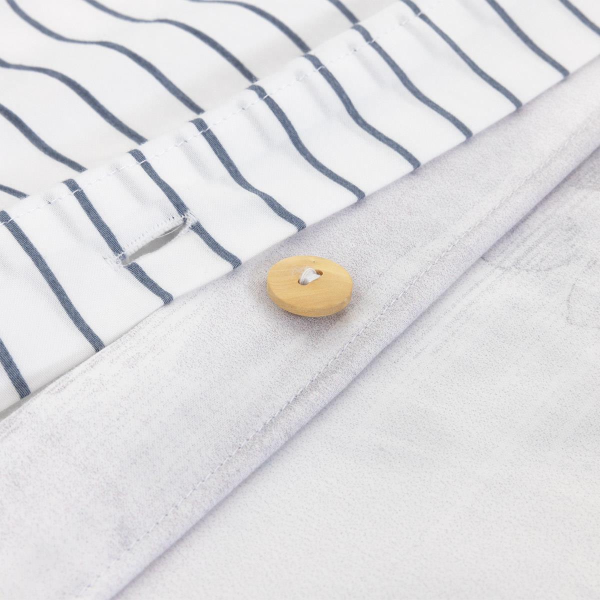 Düğmeli kapamalı nevresim ve üzerine aplikeli 45 mm beyaz timsah detayı vardır.